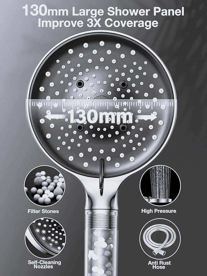 Son large diamètre de 130 mm garantit une couverture optimale pour le corps, tandis que les buses en silicone anti-calcaire se nettoient facilement à l’aide d’une simple serviette ou éponge. Son montage sans outil et son tuyau de 1,6 m, conçu pour ne pas se tordre, facilitent l’installation et l’utilisation.