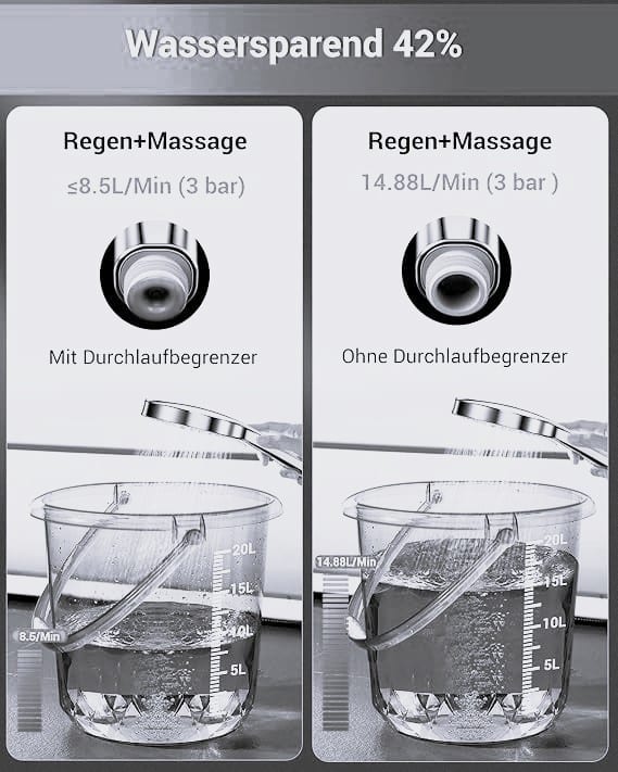 Conçu pour être à la fois performant et économique, ce pommeau intègre un limiteur de débit qui réduit la consommation d’eau jusqu’à 48,3 % en mode pluie. Tout cela sans compromis sur la puissance du jet, qui reste constant et agréable même avec une pression d’eau modérée. Grâce à ce système, vous profitez d’une expérience de douche optimale tout en maîtrisant vos dépenses d’eau. Avec un débit mesuré de 6,23 à 7,69 l/min à 3 bars, le pommeau de douche SREWOHS est une solution idéale pour les foyers soucieux de réduire leur empreinte environnementale.