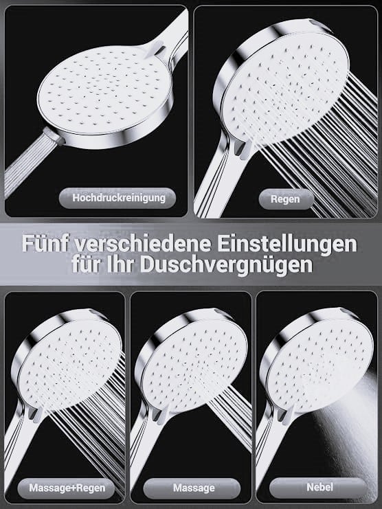 La force du pommeau de douche SREWOHS réside dans ses cinq modes de jet ajustables, chacun pensé pour répondre à des besoins variés. En tournant simplement le bouton intégré, vous pouvez choisir entre un jet massage énergisant, une pluie apaisante, un brouillard doux, ou encore un mode haute pression idéal pour un nettoyage ciblé.